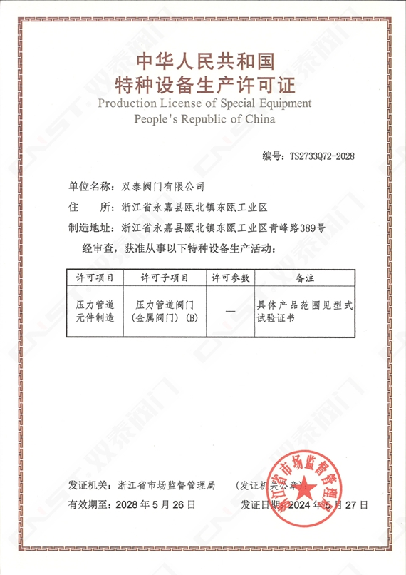 金屬閥門特種設(shè)備生產(chǎn)許可證