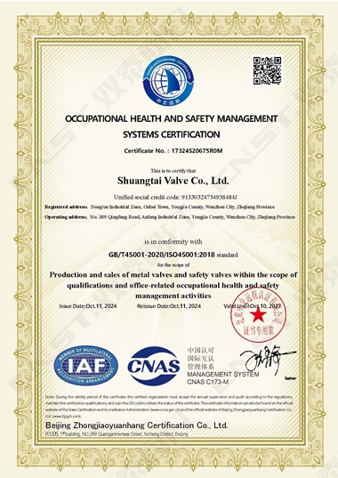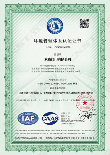 2024年10月,雙泰閥門有限公司更新資質(zhì)通過ISO9001質(zhì)量管理體系認(rèn)證、ISO14001環(huán)境管理體系認(rèn)證、ISO45001職業(yè)健康安全管理體系認(rèn)證。是獲得安全生產(chǎn)標(biāo)準(zhǔn)化達標(biāo)企業(yè)以來在管理方面的又一重大突破,標(biāo)志著工廠在管理水平方面再上一個新的臺階,并對提高公司的市場競爭力和品牌影響力有著重要的作用。對提高企業(yè)綜合管理水平,提升品牌美譽度,彰顯社會責(zé)任,降低環(huán)境風(fēng)險,起到重要的作用。